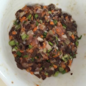 上一个我家仔仔最爱的胡萝卜木耳馅吧,在给肉调好味的基础上放入木耳碎和胡萝卜碎,再拌上点葱花。今晚吃了八个饺子,又来碗饺子汤,营养齐了!