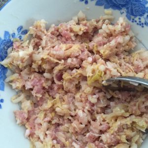 猪肉搅拌好好加入泡菜碎和油一起搅拌。在我意识里有叶叶菜就一定要加足够的油,强迫症!不能忘记,一定要同一方向搅拌!