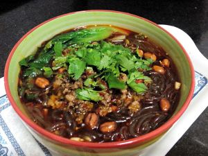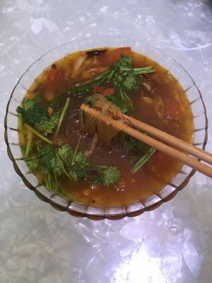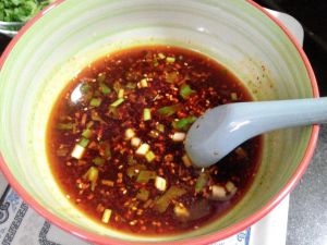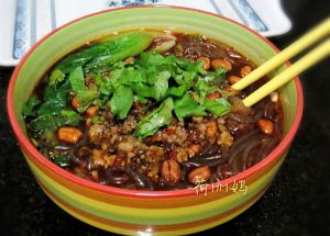 煮粉丝的时间,配调料:1/2茶匙盐,2勺生抽,1勺醋,1/2茶匙芝麻油和藤椒油,一汤勺辣椒油,少许鸡精,少许葱白和香菜梗,3汤勺面汤或大骨汤