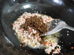 将肉末放入翻炒均匀变色,放入泡椒末,碎米芽菜翻炒均匀,放少许生抽,蚝油调味盛出。