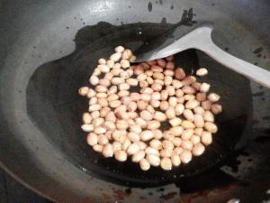 热锅凉油,放入生花生米,中小火慢慢炸,直到听到噼里啪啦,花生米外壳裂开再炒一会儿就捞出控油