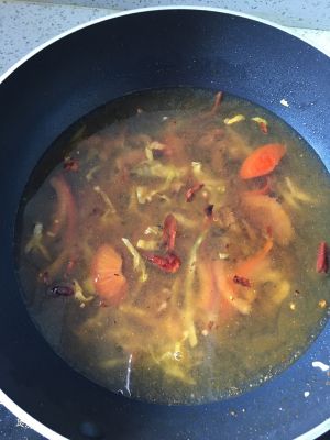 把火烧热加油一直煮到冒黑烟子哦~不要畏惧~嘻嘻~然后关火,等上2分钟~降一下温,倒入放辣椒的盆里~香啊~到完用筷子搅拌一下~OK了~