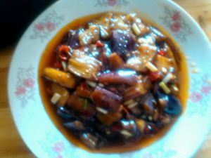 炒锅放油,七成温放茄子,翻炒到茄子均匀着油后加姜蒜泡椒末少量葱粒,炒出味后加豆瓣,略炒一会儿加少量水把茄子闷至完全成熟,下剩下的葱粒和糖醋汁收汁起锅!