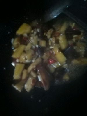 茄子腌了后用手攥干水份,放入,翻炒至8成熟。