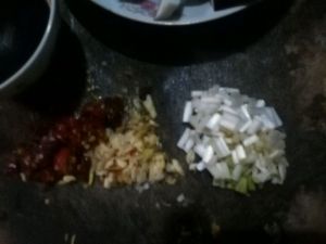 热油锅,煸炒配料,把蒜辣椒煸出香味