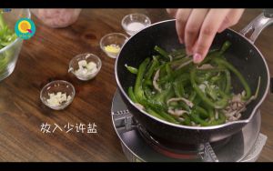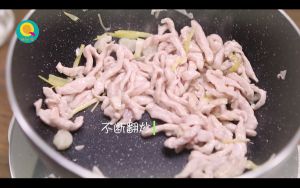 再将火开大,用油稍炒,放调料、盐、胡椒、味精,炒匀放肉丝,点一点水炒一下勾芡就可以起锅了!