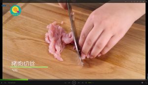 然后准备1小块里脊肉,切细丝,放料酒,生抽,胡椒粉,生粉,拌匀腌制。
