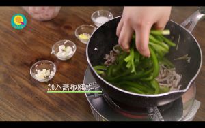 将青椒倒入干净的锅中干煸,锅中不放油,小火炒至青椒出水,继续炒,再炒到青椒水干就可以放油了。