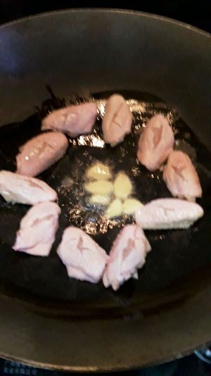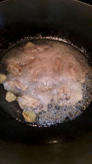 油热放生姜,爆出香味,放鸡翅先煎下。