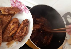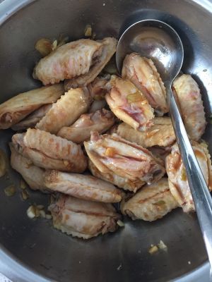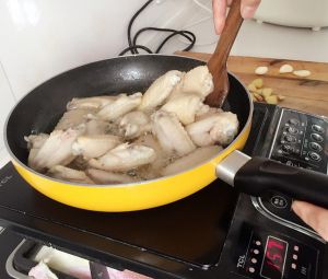 鸡翅洗净,焯水,锅内放油炸至表面金黄。