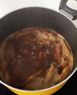 缓缓倒进半罐可乐,中火煮15分钟左右,最后大火收至剩少量酱汁,关火盛起;