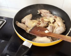 把鸡翅翻面后继续中小火煎至另一面金黄,加入2汤匙生抽,翻炒至鸡翅均匀上色;