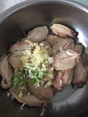 准备好辅料 葱姜蒜切好 鸡翅热水煮下去腥沫子 捞出在鸡翅背面划开两道