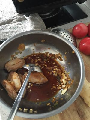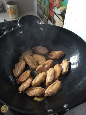 把鸡翅都放在锅里略炸下后 将刚才腌制鸡翅的汁倒入锅中 待3分钟