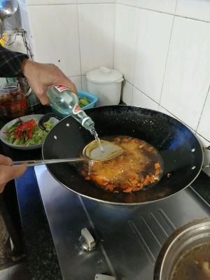 锅中烧热倒入适量的油,加入生姜,花椒,辣椒,蒜瓣炒香