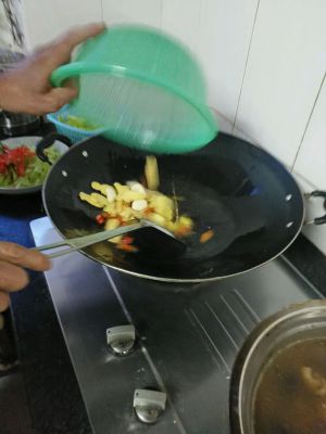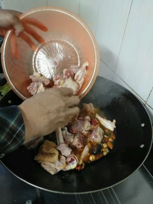 在炒锅里先放鸡肉,再放烧鸡公调料,在把准备的葱等放进去