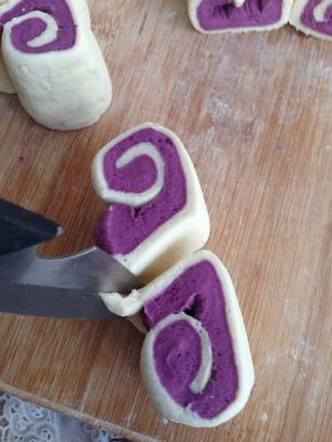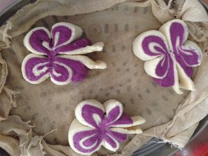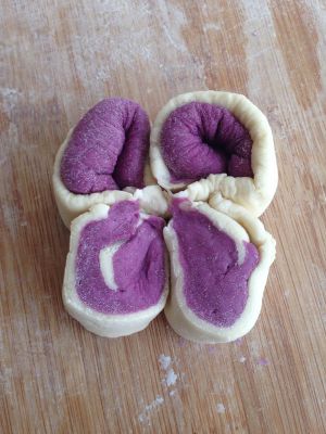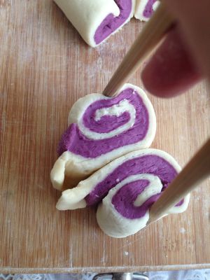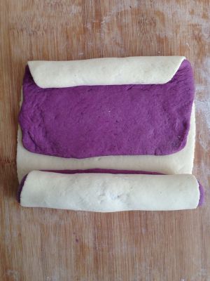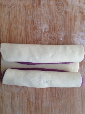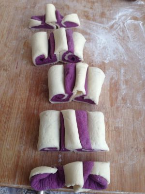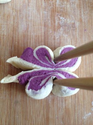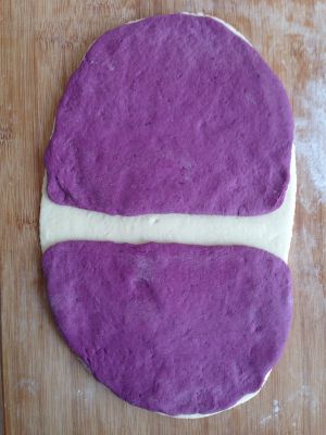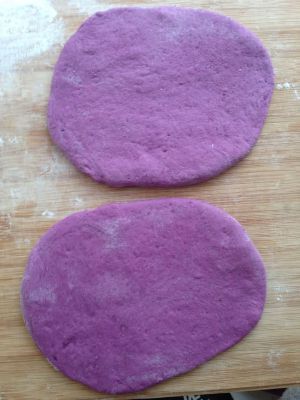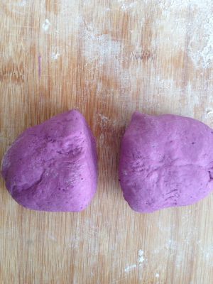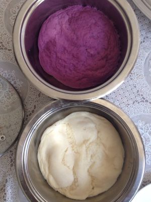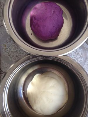 150克面粉加75克水、2克酵母揉成光滑的白面团;另外150克面粉加75克水、2克酵母、15克紫色色素揉成光滑的紫色面团进行发酵。