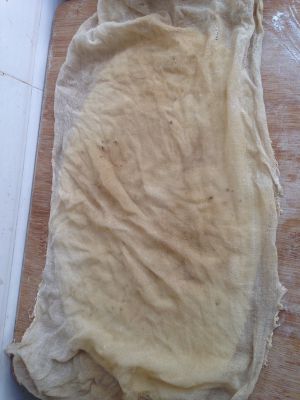 用擀面杖把面块擀成长30厘米、宽20厘米,约厚3毫米的面片。