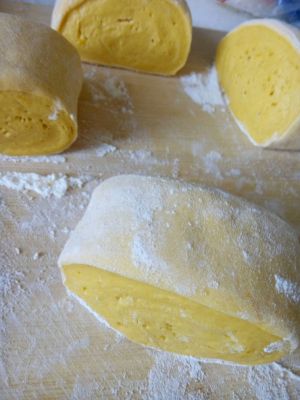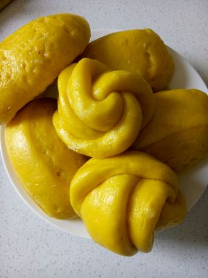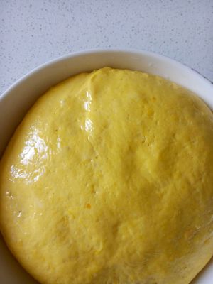 南瓜泥放凉,温水放酵母粉溶解,取一净盆放南瓜泥,酵母水适量,面粉适量。搅拌均匀和成软硬适中的面团。