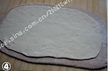 将面团1及面团2排气揉紧,醒发约15分钟左右备用;案台上撒上手粉,将面团1用擀面仗擀成长圆形面片,以此为标准将面团2也擀成长圆形面片;