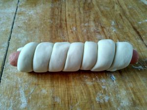 左手拿着火腿肠,右手长面条,从上往下开始缠起,开头和收尾的时候可以轻轻的按下面条,以固定在火腿肠上