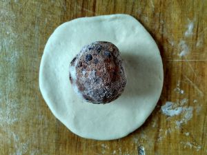 发酵好后揉搓排气,分成等份,白面擀成皮,紫薯面团揉成球