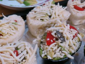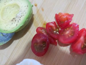 圣女果、牛油果切小块。烤箱预热上下火160度。