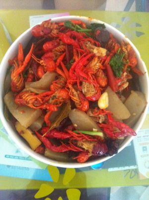 再放入小龙虾,爆炒,加入料酒少量,大概炒三四分钟,炒到龙虾变红色,开始加水煮,水量盖过龙虾量