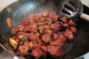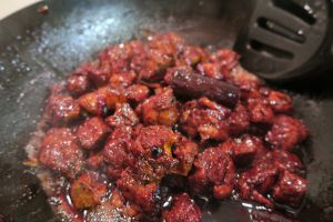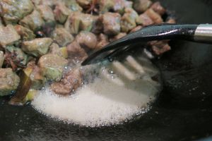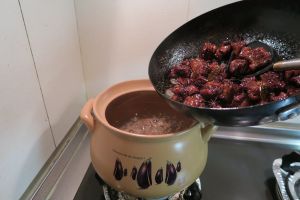 降煎制过的牛肉下锅翻炒,加入白糖适量,大约炒制10分钟后,加入清水大火烧开后小火炖制30-40分钟。