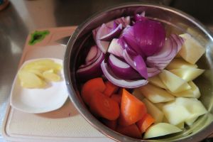 胡萝卜土豆切滚刀块儿,姜切片儿,洋葱切大块儿