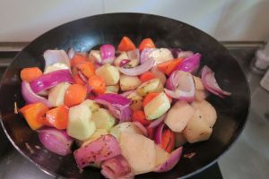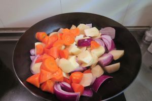 锅中热油,倒入胡萝卜土豆洋葱翻炒