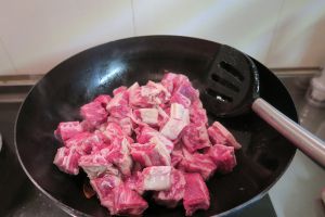 倒入牛腩,炒呀炒,这步千万不要急,一定要把牛腩里的油都炒出来才可以进行下一步