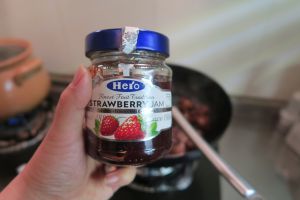 这时加两勺草莓果酱,我炖肉不喜欢放醋,所以加草莓果酱,没那么酸,又鲜甜可口(炖肉时加入醋或番茄酱之类酸的调味,可以把肉很快炖烂)