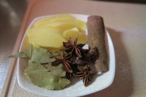 准备香叶八角桂皮,和姜片儿放在一块儿备用