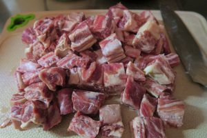 牛腩泡冷水一小时后温水按摩洗净(为了去血水)切成1厘米见方块儿