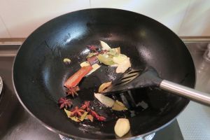 再加入茴香、桂皮、草果、八角、香叶、陈皮翻炒。