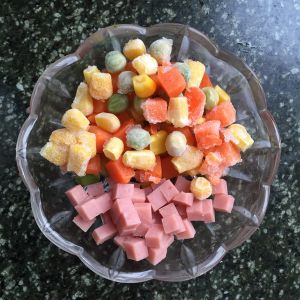 火腿切丁,玉米、豌豆超市有冷冻包装卖,材料的量根据个人喜好放