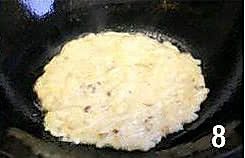 锅中倒少许油,将糊糊均匀撒入锅中铺平,用中小火没面煎成金黄色即可。