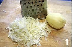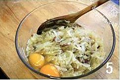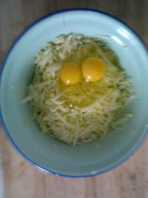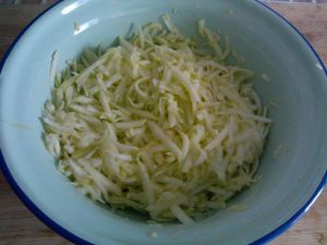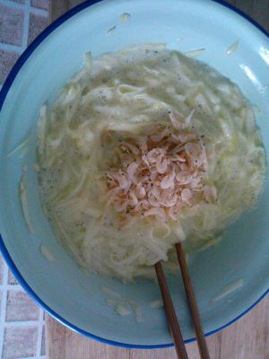 用擦子把西葫芦擦成丝。注意不要太细了,否则会影响口感。