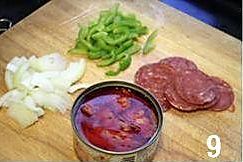 准备好做披萨的原料,我准备了五香味道的金枪鱼罐头、萨拉米肉肠、洋葱、青椒。