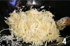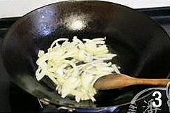 洋葱炒出香味后放入土豆丝继续翻炒,土豆丝炒熟后放入盐调味。