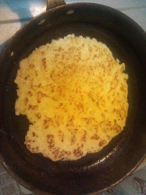 在煎锅里面放一点点油,倒入面糊用铲子铺平,中火煎。煎熟后翻面煎另一面。两面都成焦黄色后便可出锅。