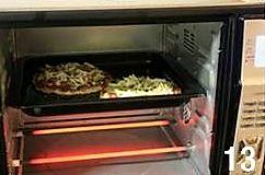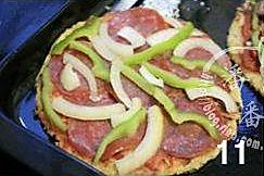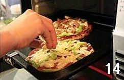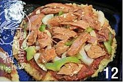 把酱在已经做好的土豆饼上涂一层,码放上事先准备的馅料。11号图是萨拉米匹萨。