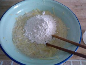 加适量水调成面糊~~所谓适量,是需根据西葫芦的出水量酌情添加,要少量少量慢慢地加水,至面糊能比较顺利摊开成均匀的薄饼即可。水过少面团不易散开会导致软饼厚薄不均;水过多则会使饼过于软烂而影响口感,一点一点逐量添加,多试几次就有经验了。