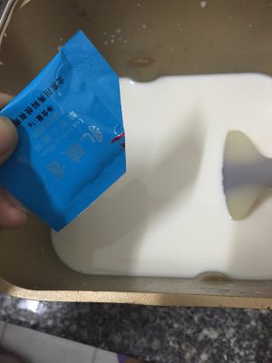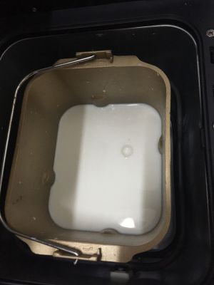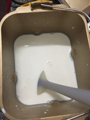 将纯牛奶倒入内胆里,依次加入菌粉,白糖,搅拌均匀,一定要搅拌均匀;