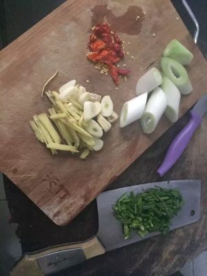 葱姜蒜干辣椒切丝切块,油锅烧热煸香