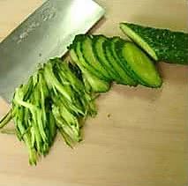 黄瓜先切片再切成丝,香菜切段,红辣椒切成圈;