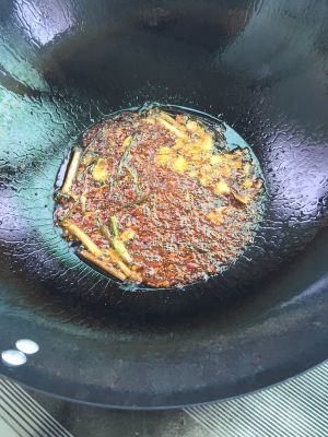 国内放适量油,油热之后下姜片,大蒜和小葱,喜欢麻辣的可以放点花椒。爆出香味关火,再放入适量辣椒,稍微拿铲子搅拌一下。