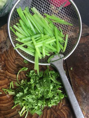 芹菜 切条 香菜 切开 芹菜放开水里面烫一下 颜色变青翠了捞出