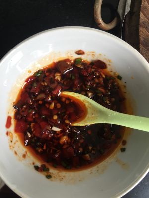 辣汁准备OK,将辣子和盐葱花蒜泥姜丝香醋酱油一起调味,依个人口味准备即可